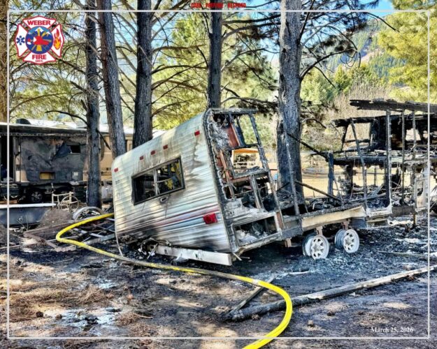 “The initial report from a neighbor indicated a backyard fire,” the post said. “Upon arrival, Weber crews found a camp trailer fully engulfed. A second nearby trailer sustained heavy fire and smoke damage, along with a shed and miscellaneous equipment. The trailers were surrounded by mature pine trees, adding to fire risk and complexity.