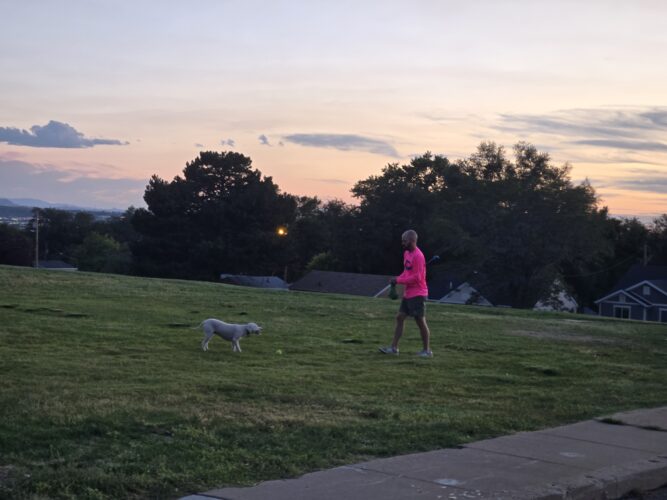 From the parking lot at 21st Street near Taylor Avenue, Mount Ogden looms to the east. Evening light illuminates Ben Lomond between the houses. The sunset colors the western sky.