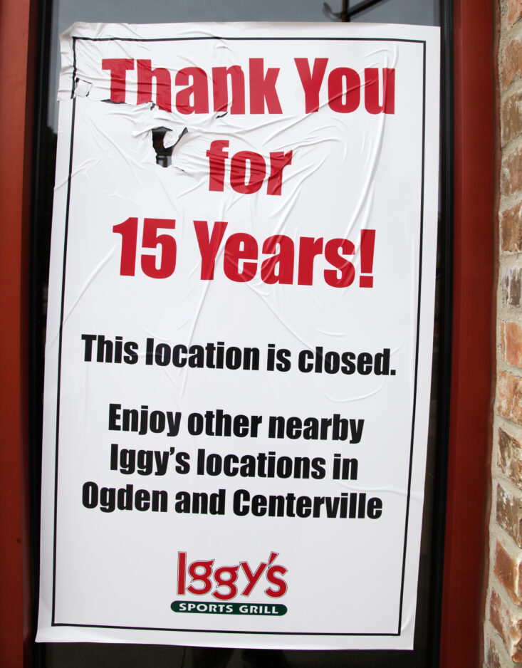 Only the outline of the name remains at the Iggy’s Sports Grill, 802 W. 1425 North in Layton, and a sign thanking customers for 15 years of patronage.