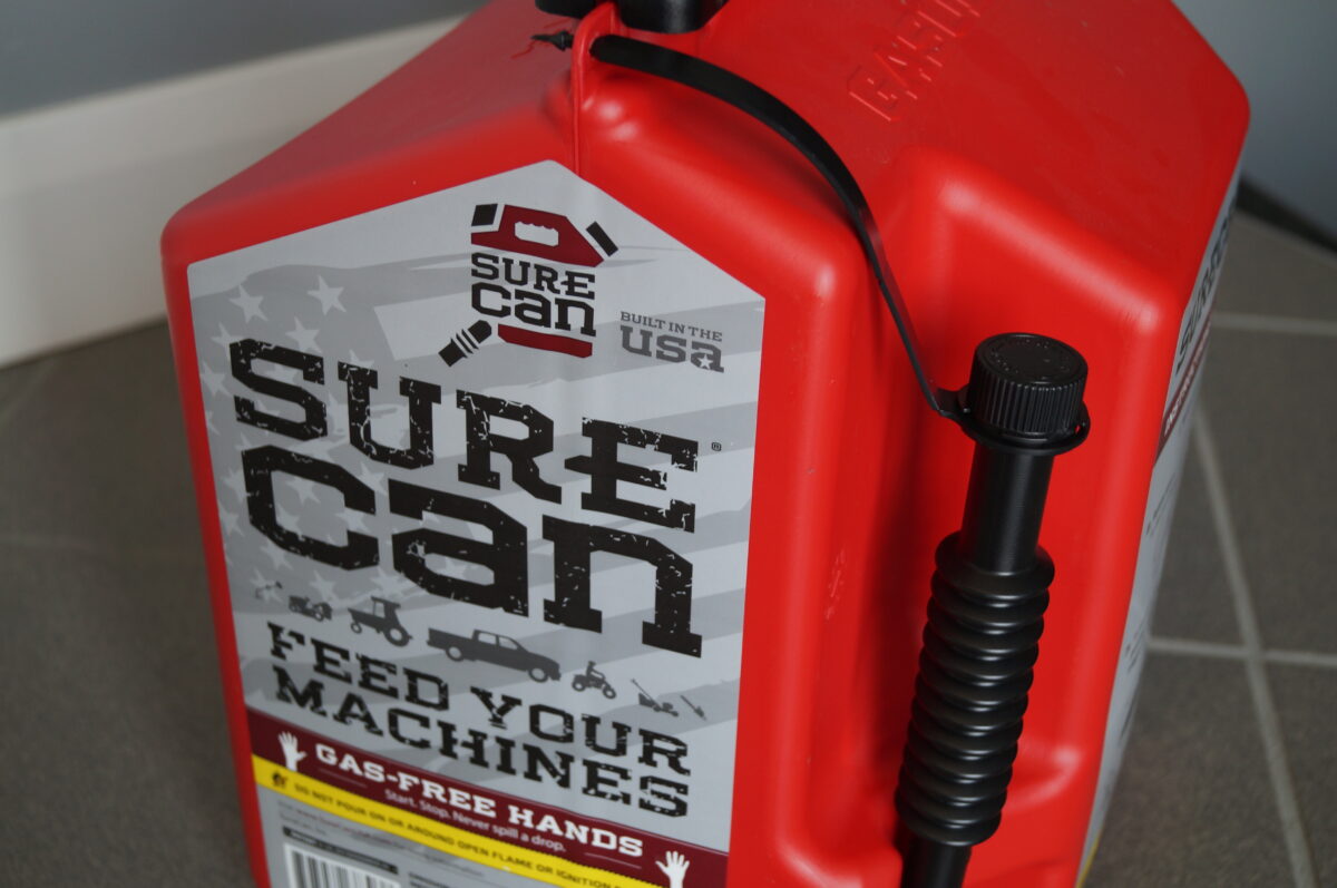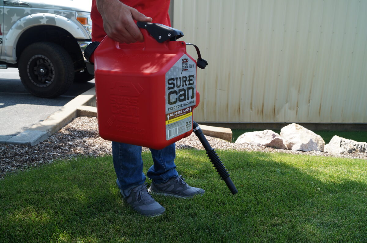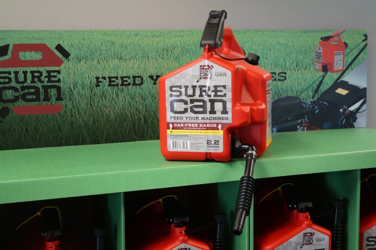 SureCan features an adjustable spout at the bottom of the can, not the top. The gasoline, therefore, flows from the can down the spout into the machine. The can removes the need to tip the can to pour and instead uses a thumb-release trigger to start the flow. It also has a six-layer plastic technology. The layers keep fumes from penetrating through the barrier. “You won’t be able to smell it if you leave it in your car,” Ouderkirk said.