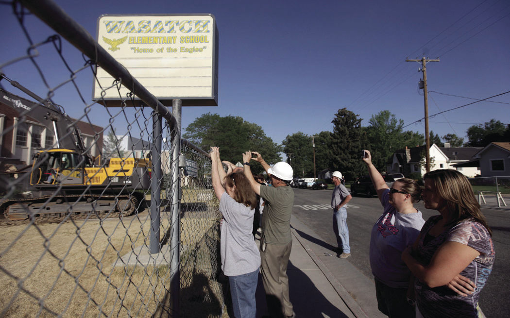 CLEARFIELD — It was a solemn moment for the crowd of teachers, parents and students of Wasatch Elementary School as they watched the claws of a large excavator tear into the front of their old school, ripping down walls and windows in seconds.