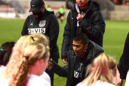In this undated 2020 photo, Davis High girls soccer coach Souli Phongsavath, center right, is seen coaching during a match.