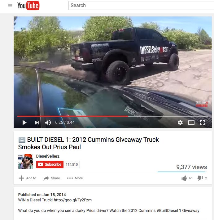 This screen grab of a video posted to You Tube by Davis County-based DieselSellerz shows one of their trucks deliberately blowing smoke at a Prius. The DieselSellerz mechanics later became the stars of the reality TV show, “Diesel Brothers.”