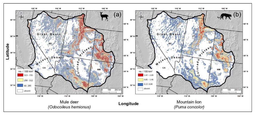 By comparison, Nevada’s Great Basin Desert has fewer deer and cougars per 100 square miles — at best, there’s around two cougars and 750 deer.