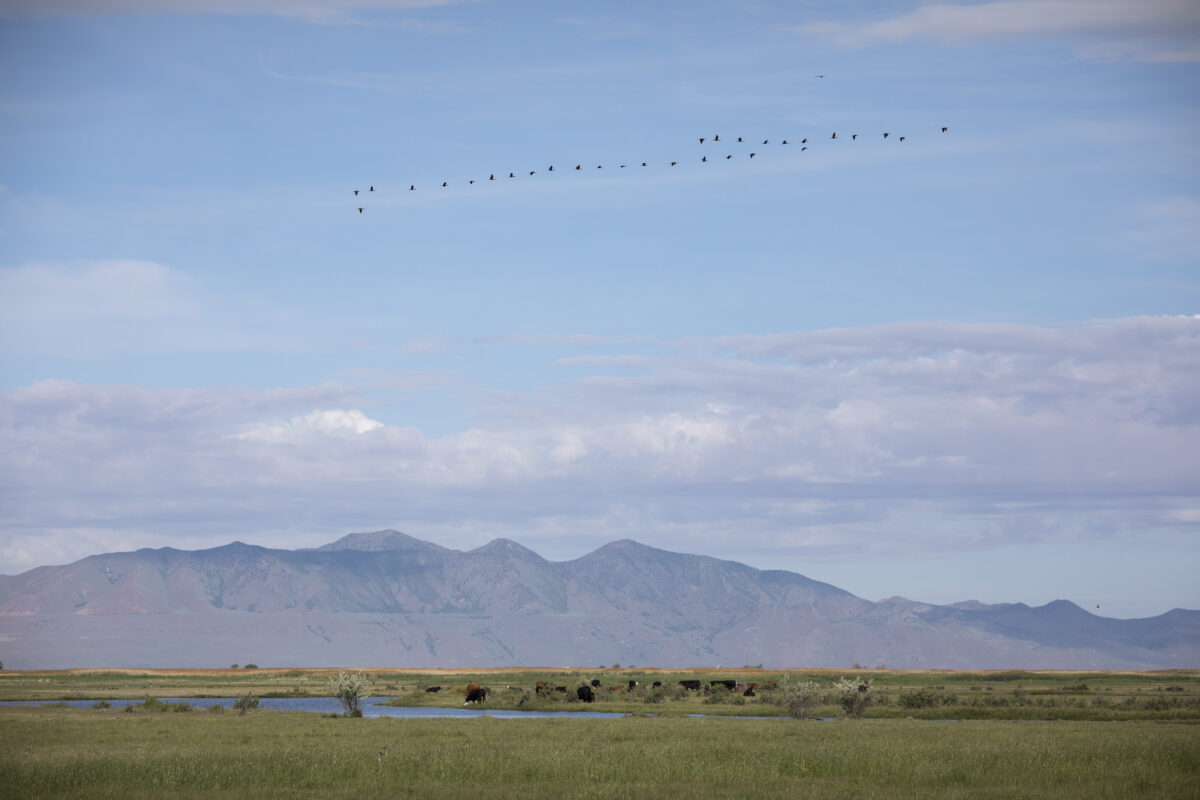 Cattle graze and birds fly by near the northeastern edge of the Great Salt Lake in far western Weber County on Tuesday, May 23, 2018.