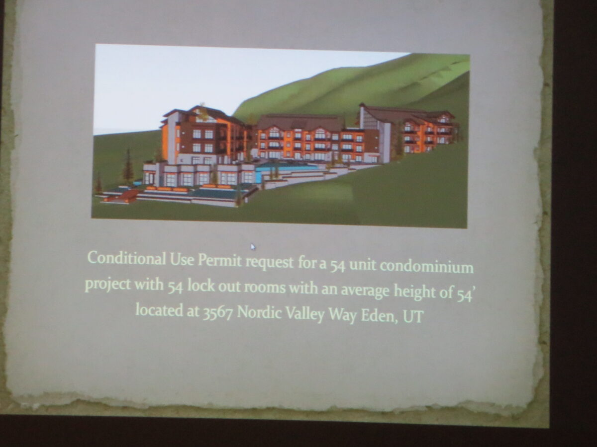 Commission Chairman Pen Hollist said that the 54 condos with attached lockout units fully comply with the law and that the fire chief certified that firefighting equipment in the upper Ogden Valley is already adequate to service the new structure. The location of the building was adjusted to allow a full fire-access lane.