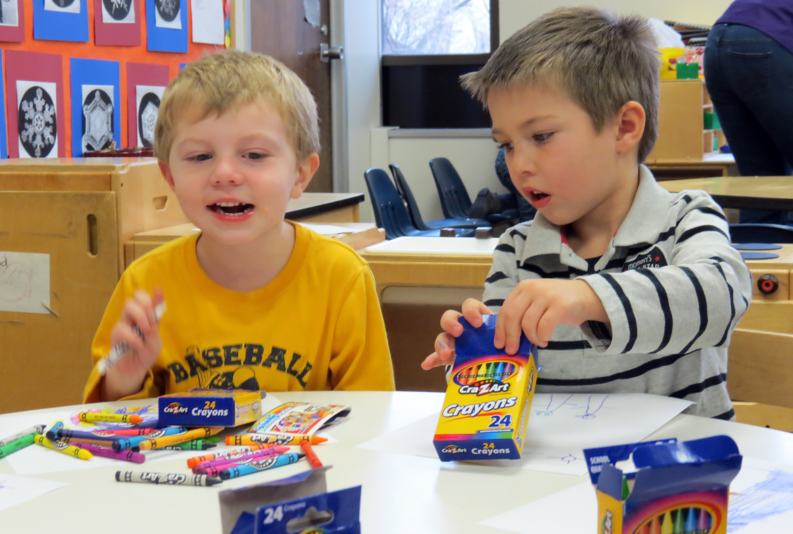 The young students then were given a blank page and a single crayon — Wildcat purple, of course — to draw a picture. The preschoolers quickly became bored, until they were given complete boxes of crayons to finish their art. The take-home lesson was about the value of diversity, both in friendships and in art.