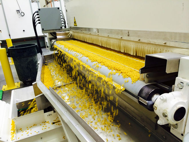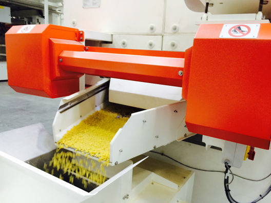The machinery has a continuous-flow design, where the pasta is extruded, dried and packaged. In just one hour, it produces 1,700 pounds of spaghetti and 1,300 pounds of “short goods” such as macaroni and ribbon. A third line packages macaroni and cheese at a rate of up to 60 boxes per minute. It operates on 24-hour shifts.