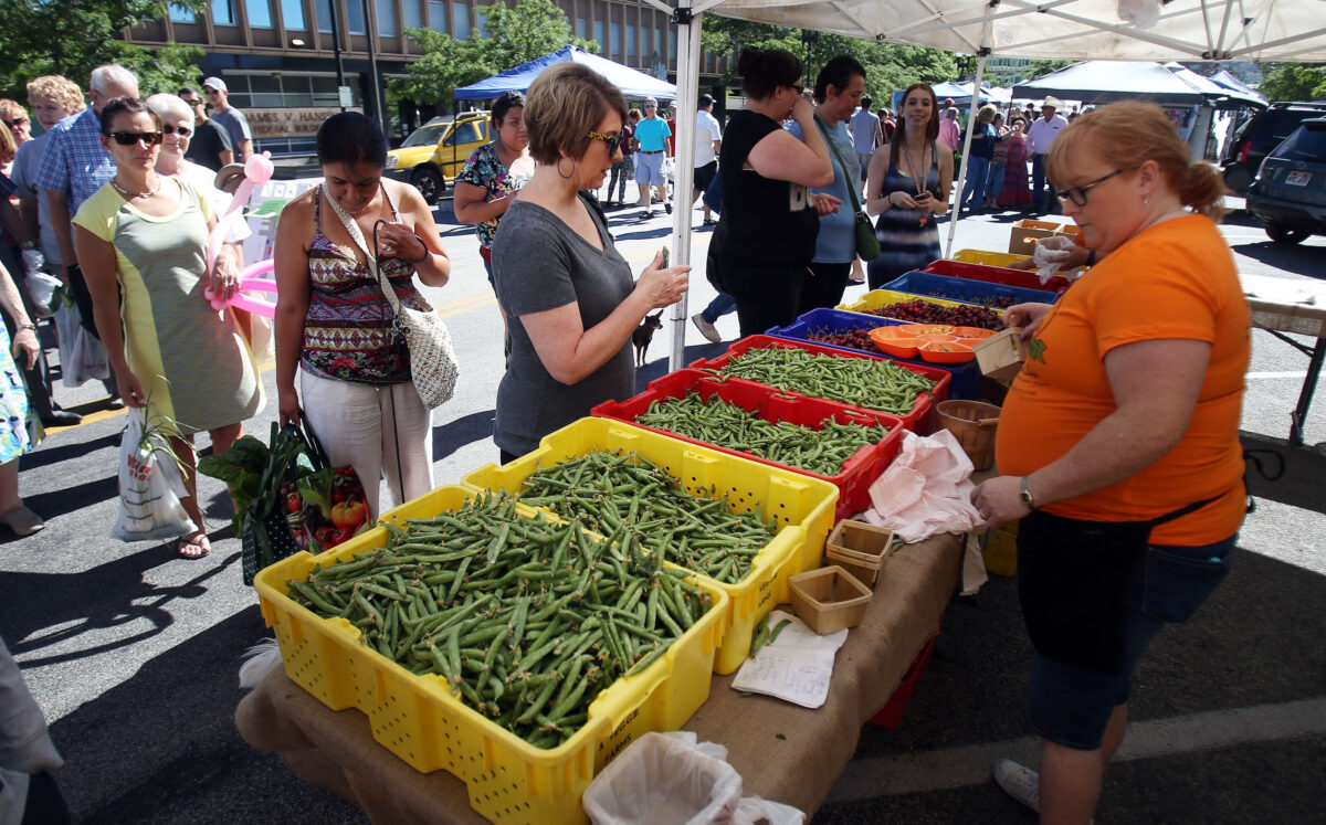 Stephanie Grotzky, left, purchases some produce from Bonnie Biskey of Tagge’s Famous Fruit and Veggie Farms on Saturday, June 24, 2016, during the opening day of the Ogden Farmers Market on 25th Street.