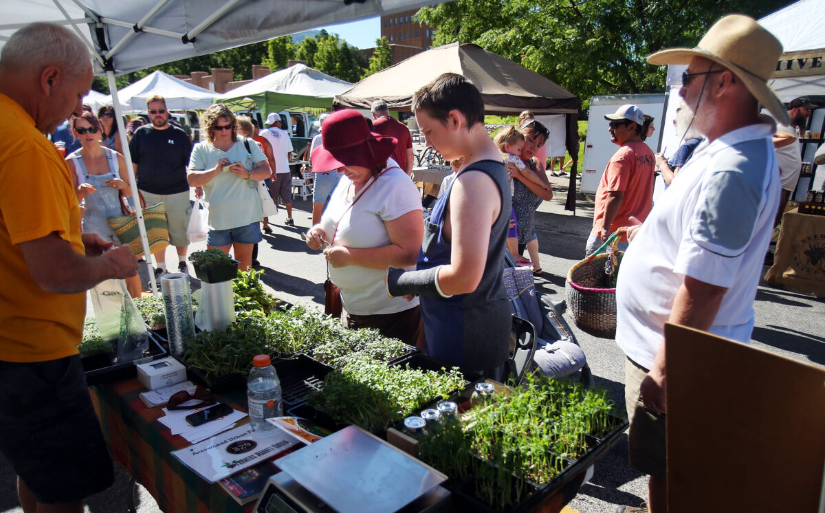 Crowds check out the booth of Arrowhead Urban Farms during the opening day of the Ogden Farmers Market on 25th Street Saturday, June 24, 2016. (BRIAN NICHOLSON/Special to the Standard-Examiner)