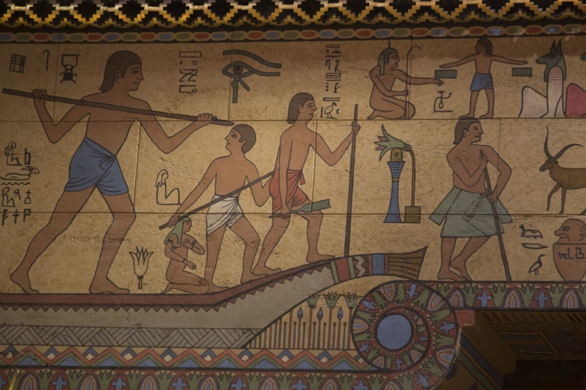 The entryway and lobby are ornately decorated with brightly-colored Egyptian idols and hieroglyphics cover the walls.