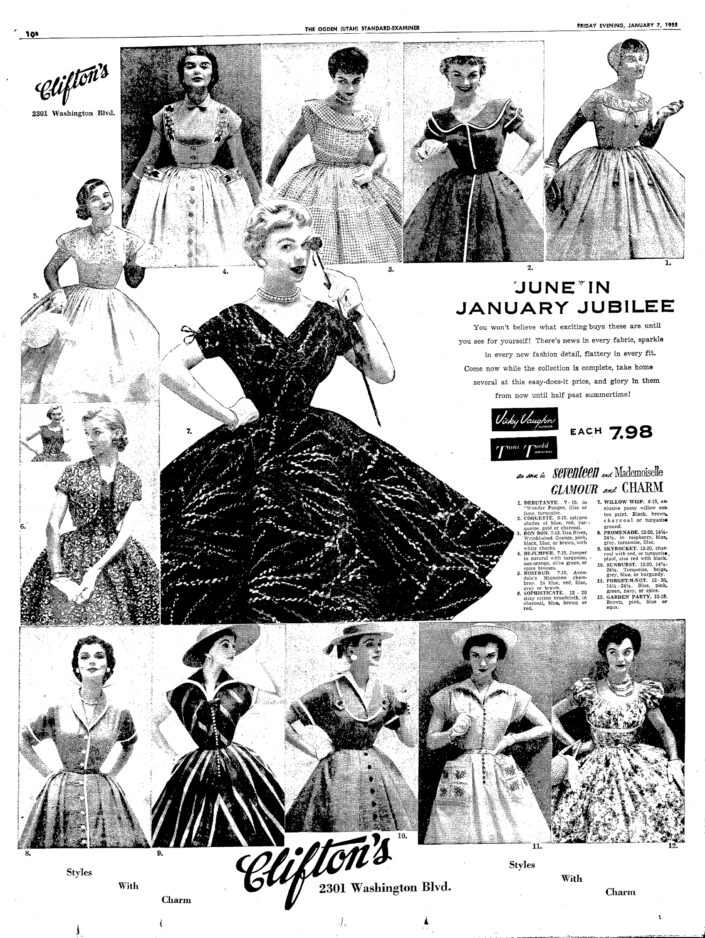 A full-page advertisement for Clifton’s Ladies Apparel from a 1955 Standard-Examiner.