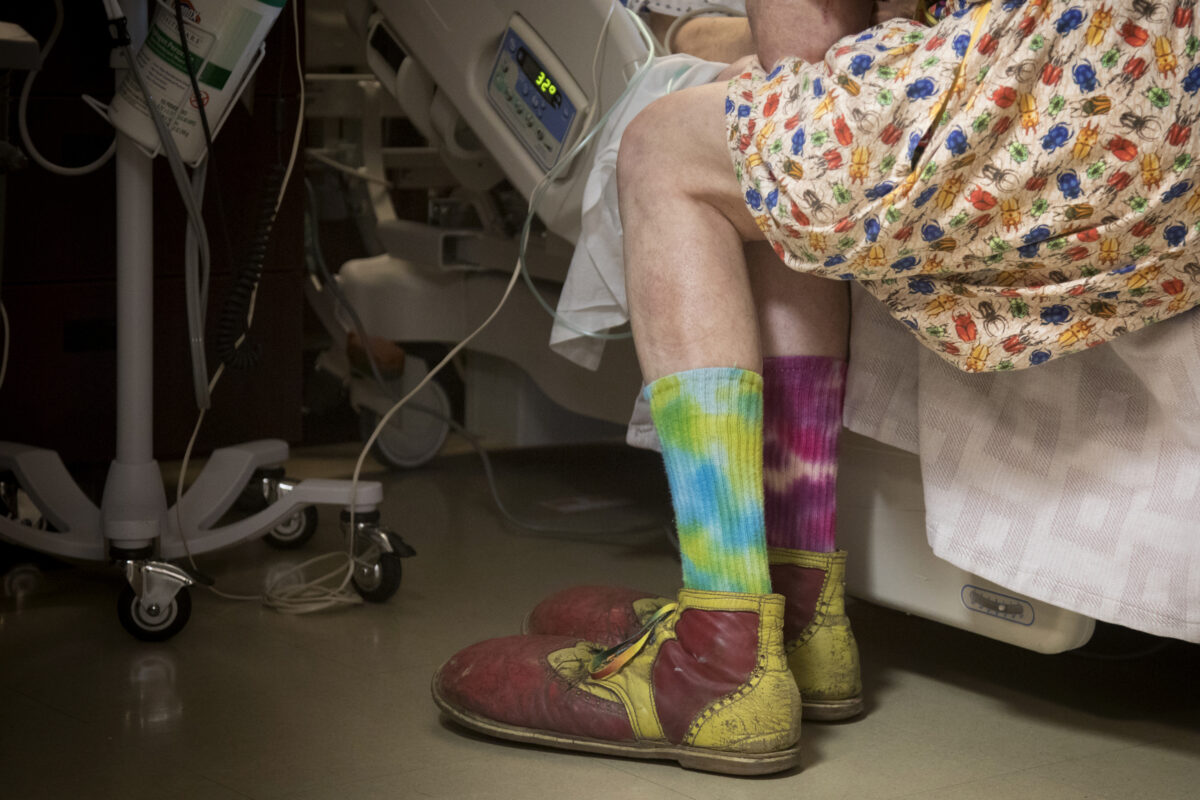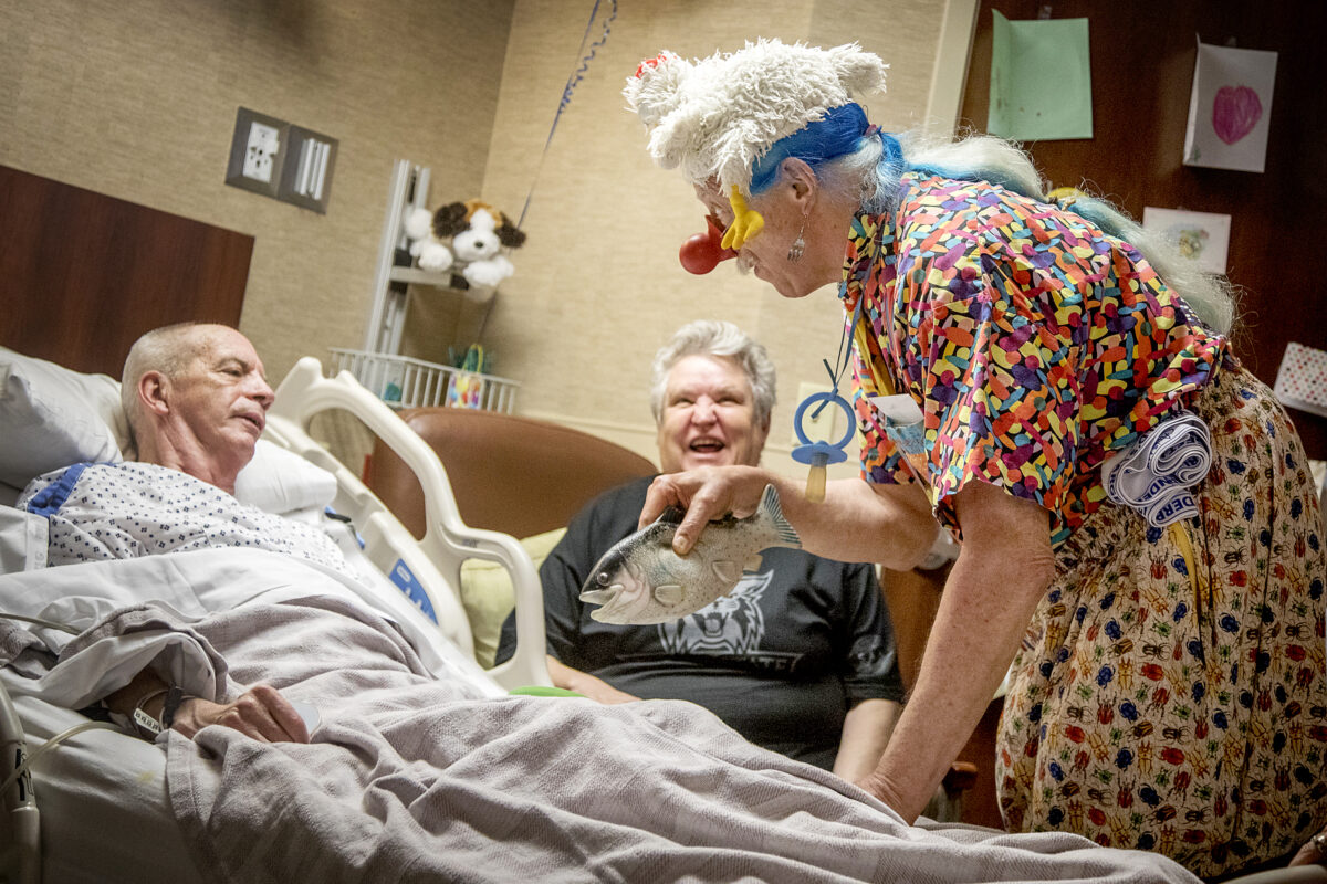 Patch Adams visits with a patient at the Ogden Regional Medical Center on Wednesday, May 16, 2018. Adams lives in Illinois but was in Ogden for the Ogden Surgical Medical Society Conference. Following the conference, Adams made rounds with some of the patients in serious care at the hospital while in his iconic clown outfit and with pockets full of props.