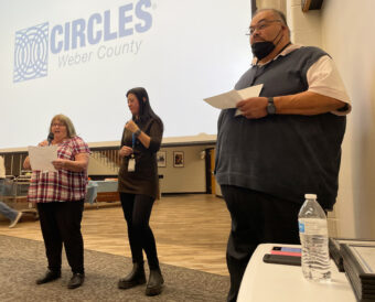 - Reps from the Ogden-Weber Community Action Partnership address a ceremony on Wednesday, March 2, 2022, to honor participants finishing the first phase of the Circles program. From left are Nicki Bray, Circles coordinator, and the leaders who helpd run classes, Yudy Hernandez and Gene Lopez.
