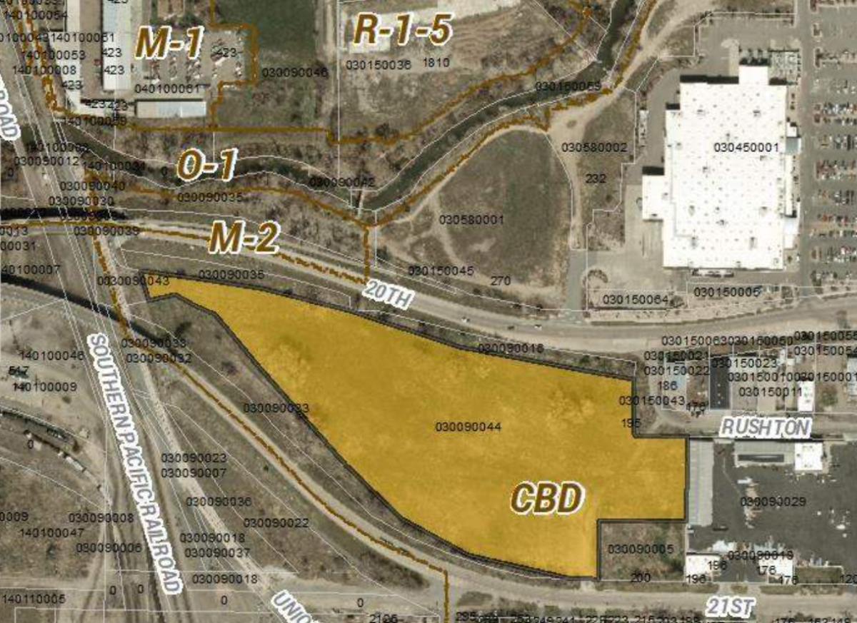 - The yellow-shaded area in the image shows the site of the proposed Railyard Lofts Apartments development proposal off West 20th Street and south of the Lotus Riverwalk development.