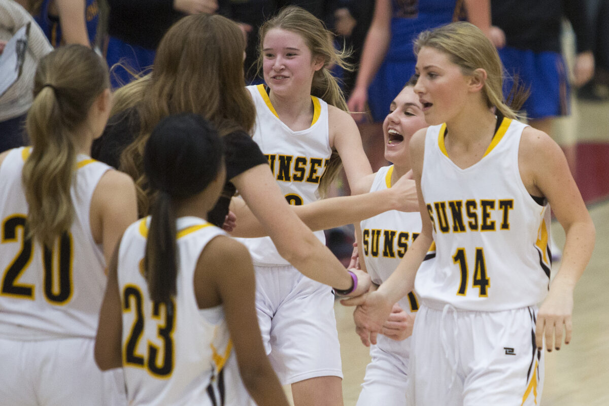 Sunset Junior High’s Sierra Sivulich runs to the Assistant Coach Nikki Wheeler when a timeout was called after Sivulich scored a three during the Davis School District title game against Centerville Junior High on Wednesday, Feb. 8, 2017 at Northridge High School in Layton. Sunset defeated Centerville 45-29.