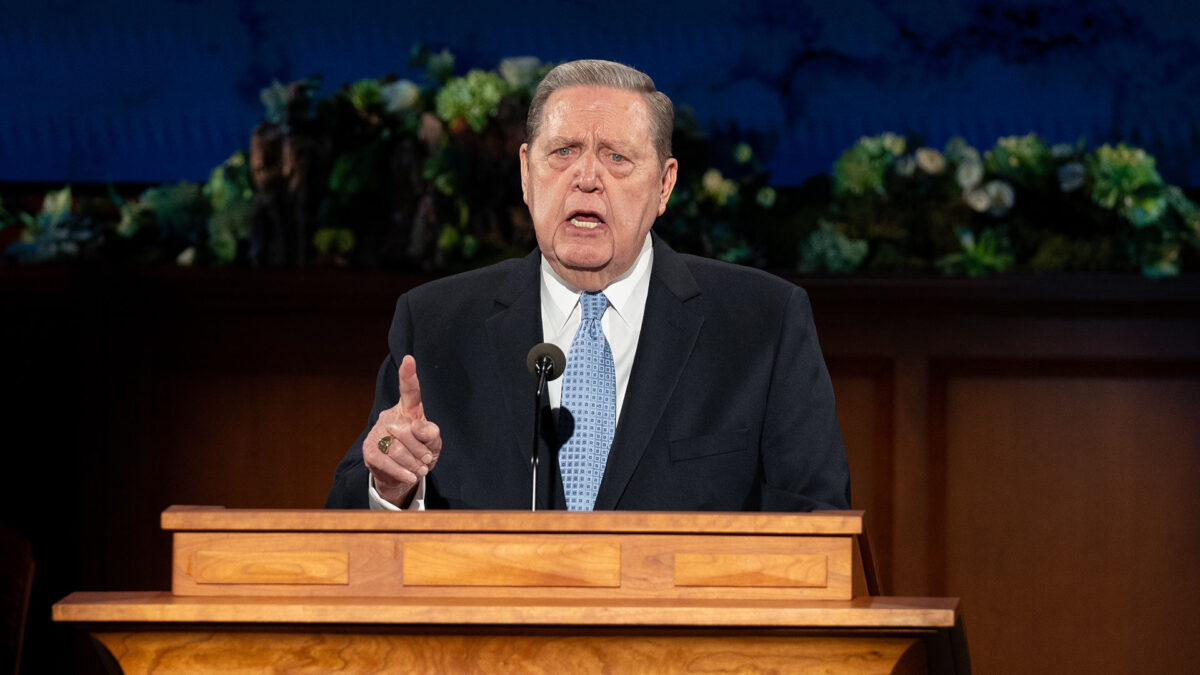 - President Jeffrey R. Holland, acting president of the Quorum of the Twelve Apostles, gives the first speech during the morning session of general conference at the Conference Center in Salt Lake City on Saturday, April 5, 2025.