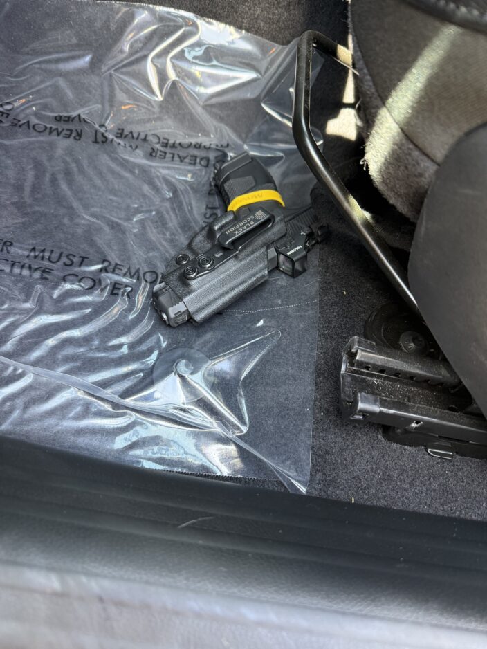 “I thought, what if there were children that were in that vehicle at the time and they grabbed ahold of it?” Brown said. “I’ve raised a couple kids and I’ve got a grandkid. They just go out and play in the garage. What if they opened the car up and they pulled the handgun out. The officer told me that it was loaded and all it needed was a charge. It easily could’ve had the band removed, been charged and then fired.”