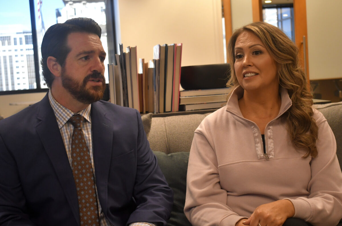 - Cheryl, right, talks with attorney Michael Young at the law office of Parsons Behle & Latimer in Salt Lake City on Wednesday, March 18, 2026.