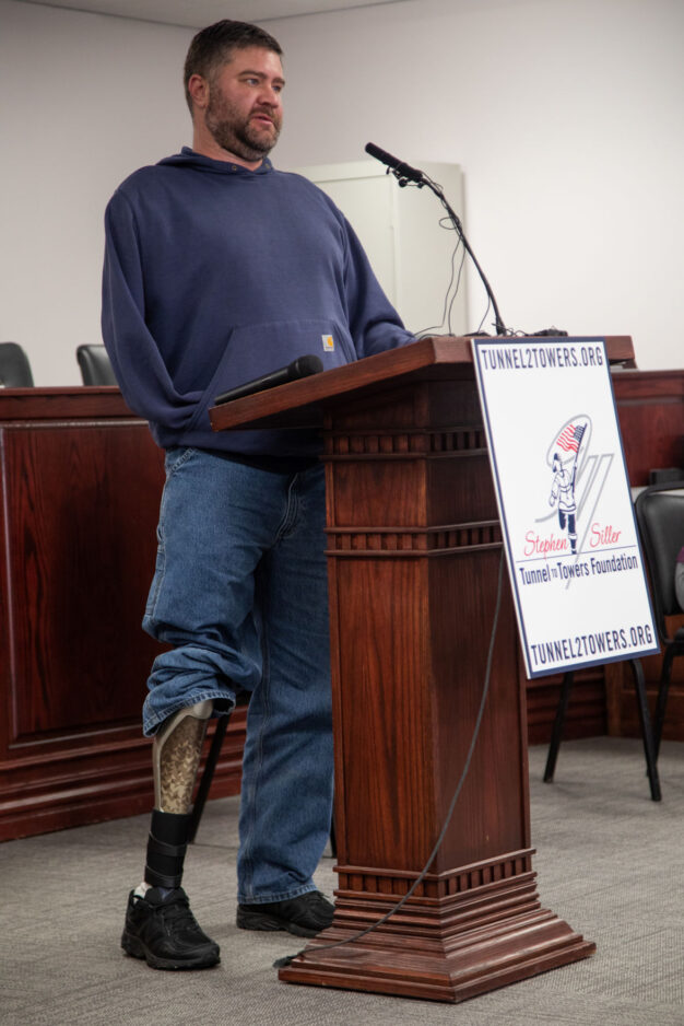 Local injured veteran, Marine Sgt. Brian Johnston, speaks at a press conference at North Ogden’s city hall where the New York-based Tunnel to Towers Foundation announced that they will provide a technologically smart home to Johnston and Army Sgt. 1st Class Travis Vendela.