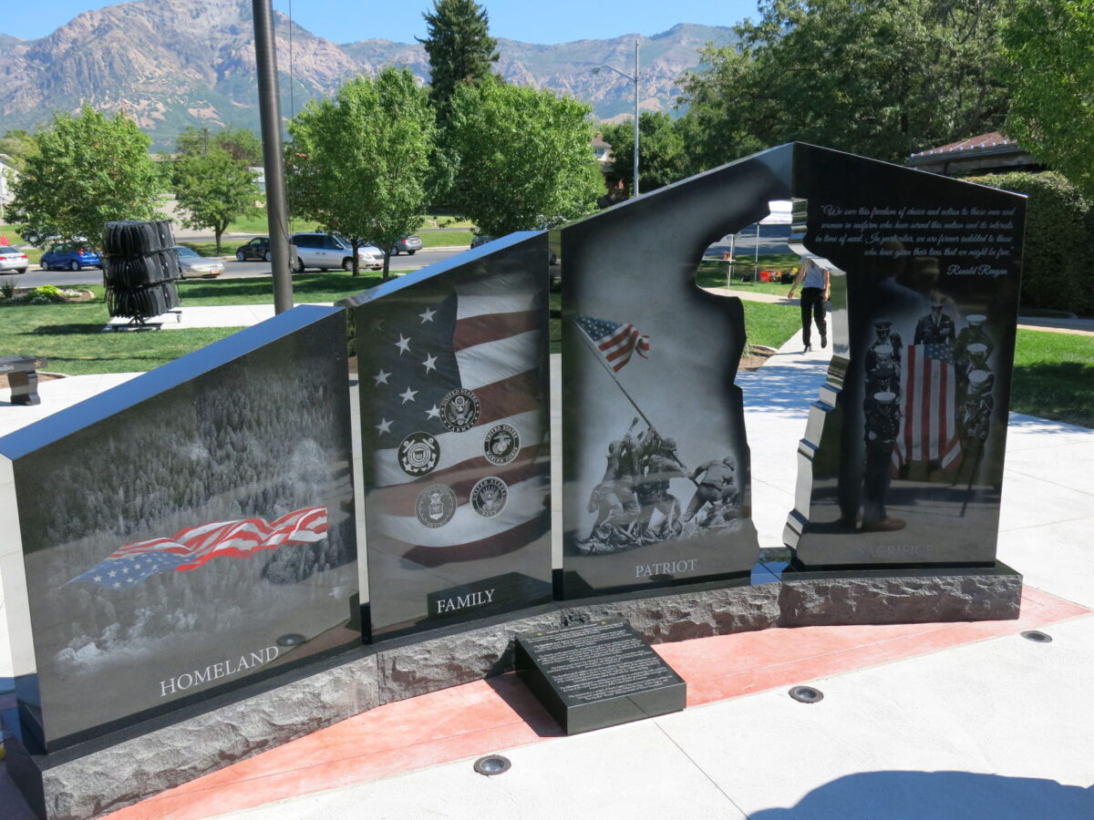 On the south side, each of the four panels is dedicated to a different concept: “Homeland,” “Family,” “Patriot,” and “Sacrifice.” The monument includes various images of flags, along with a Ronald Reagan quote. The two largest sections of the monument have been cut out so that the missing space creates the outline of a saluting service member.