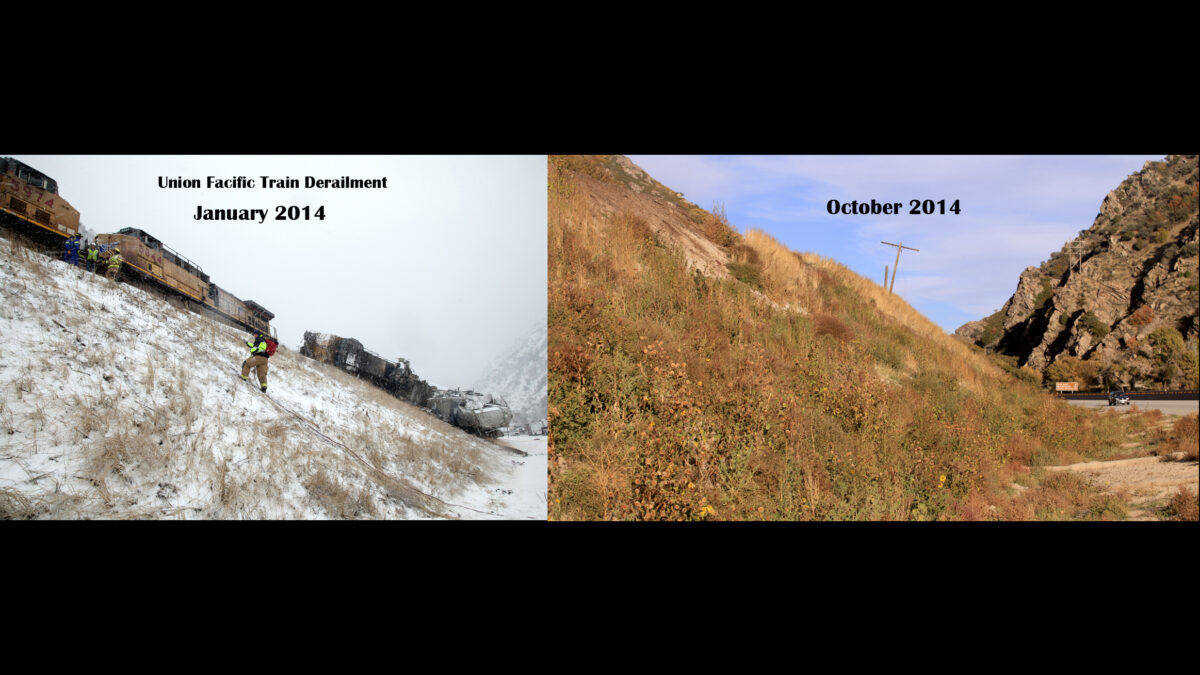 The train wreck on a snowy morning in Weber Canyon near Interstate 84 took several days to clean up. It was caused when a Union Pacific train rear-ended another. Only two people working for the railroad suffered minor injuries, but it could have been worse if the rail cars that derailed had spilled over onto the major interstate.