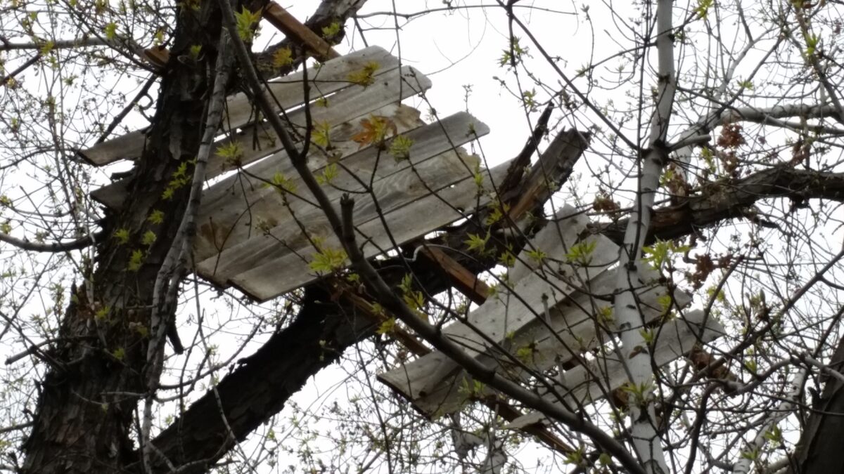 “Every once in awhile we see another plank on the ground,” she said. “We thought we could throw something up there and maybe knock it down, but it’s caught pretty tight in two or three branches. We’d have to climb up there to get it down.”