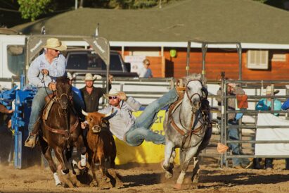 - A cowboy jumps from his horse to a cow during a steer wrestling event at the Ogden Pioneer Days Rodeo on Wednesday, July 23, 2025.