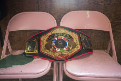 (Secondary) Diego Alvarez’s championship belt was set on a pair of pink chairs in Ogden on Tuesday, May 24, 2016. Diego won the 114 pound National Golden Gloves title over the weekend.