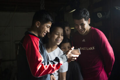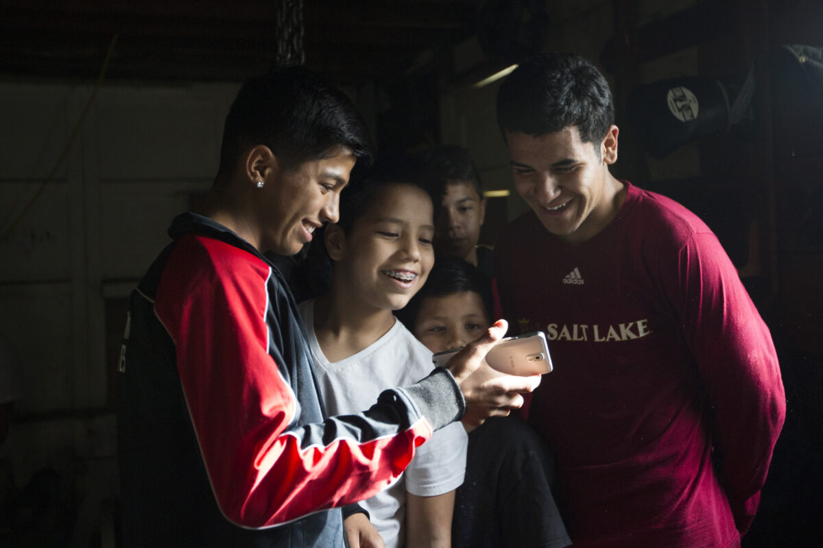 (Secondary) Diego Alvarez, left, 17, shares a video on his phone with Jayden Lopez, 15, clockwise from center left, Giovanni Rodriguez, 13, Juan Palafox, 18 and Lalo Lopez, 10, before training in Ogden on Tuesday, May 24, 2016. Diego won the 114 pound National Golden Gloves title over the weekend.