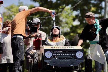 Elsewhere, “Heidi’s Hooligans,” the Swiss Alps-themed vehicle driven by Kyle Stringham and family, brought enough size to outlast any physical barriers. Midway down the course, Stringham and the Hooligans flew through the man-made barriers and collided with the media pit.