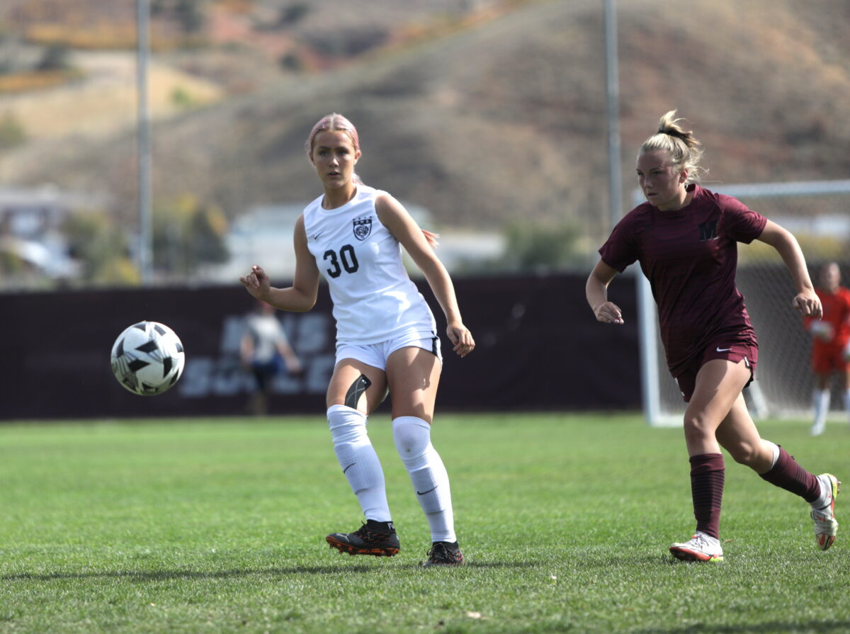 - Ogden High’s Kate Wadsworth (30) hits a pass as the Tigers and Morgan face off in the 3A girls soccer state quarterfinals Saturday, Oct. 15, 2022 in Morgan.