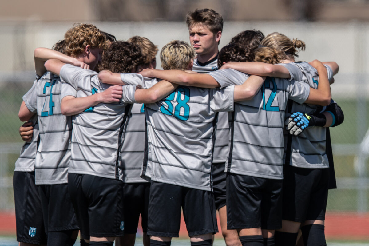 - Farmington boys soccer players huddle during a match against Fremont on Friday, April 28, 2023, in Farmington.
