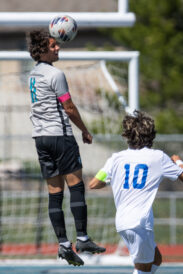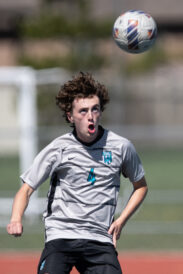 - Farmington’s Dayton Patrick heads the ball in a match against Fremont on Friday, April 28, 2023, in Farmington.