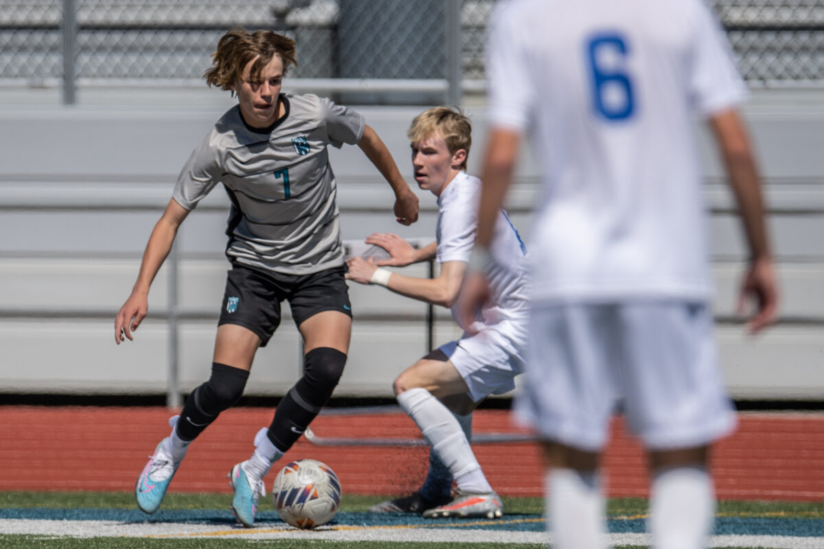 - Fremont’s Garrett Bruce controls the ball in a match against Farmington on Friday, April 28, 2023, in Farmington.