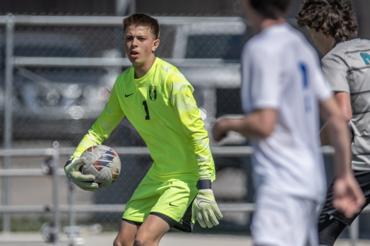 - Fremont keeper Ryker Loock (1) surveys the field in a match against Farmington on Friday, April 28, 2023, in Farmington.