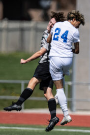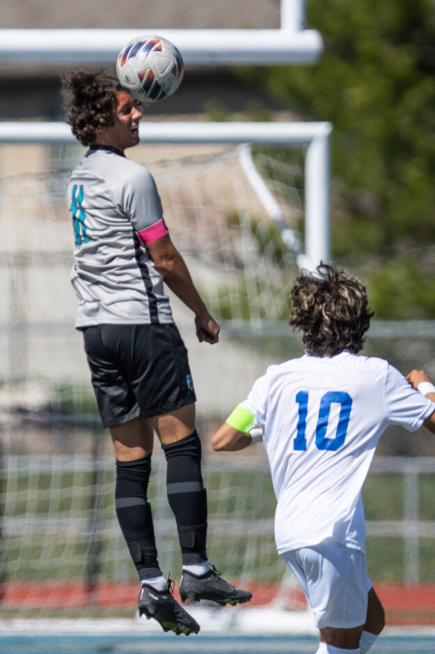 - Farmington’s Coleman Stettler (11) jumps to head the ball as Fremont’s Naime Odeh (10) looks on during a match Friday, April 28, 2023, in Farmington.