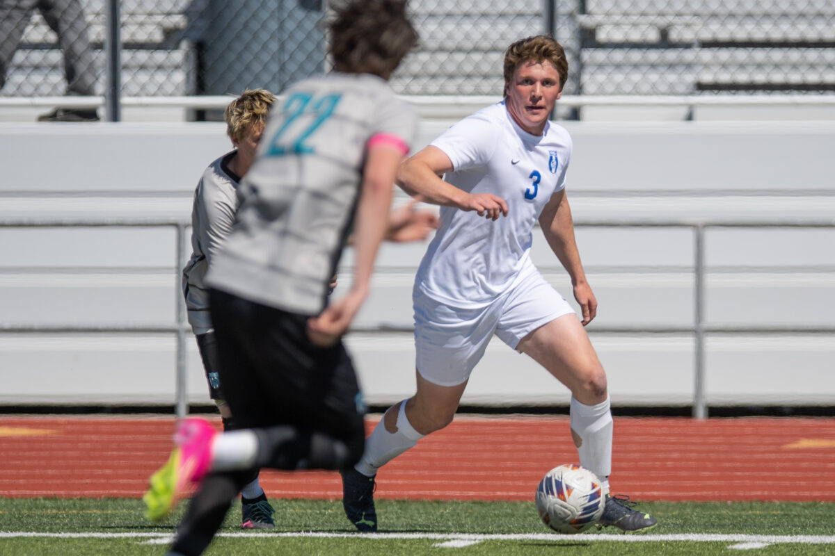 - Fremont’s Levi Rowley (3) handles the ball as Farmington’s Chase Ashby (22) approaches during a match Friday, April 28, 2023, in Farmington.