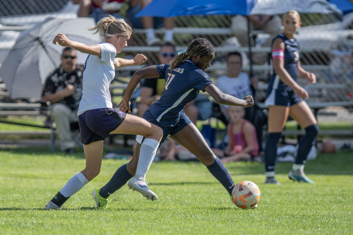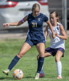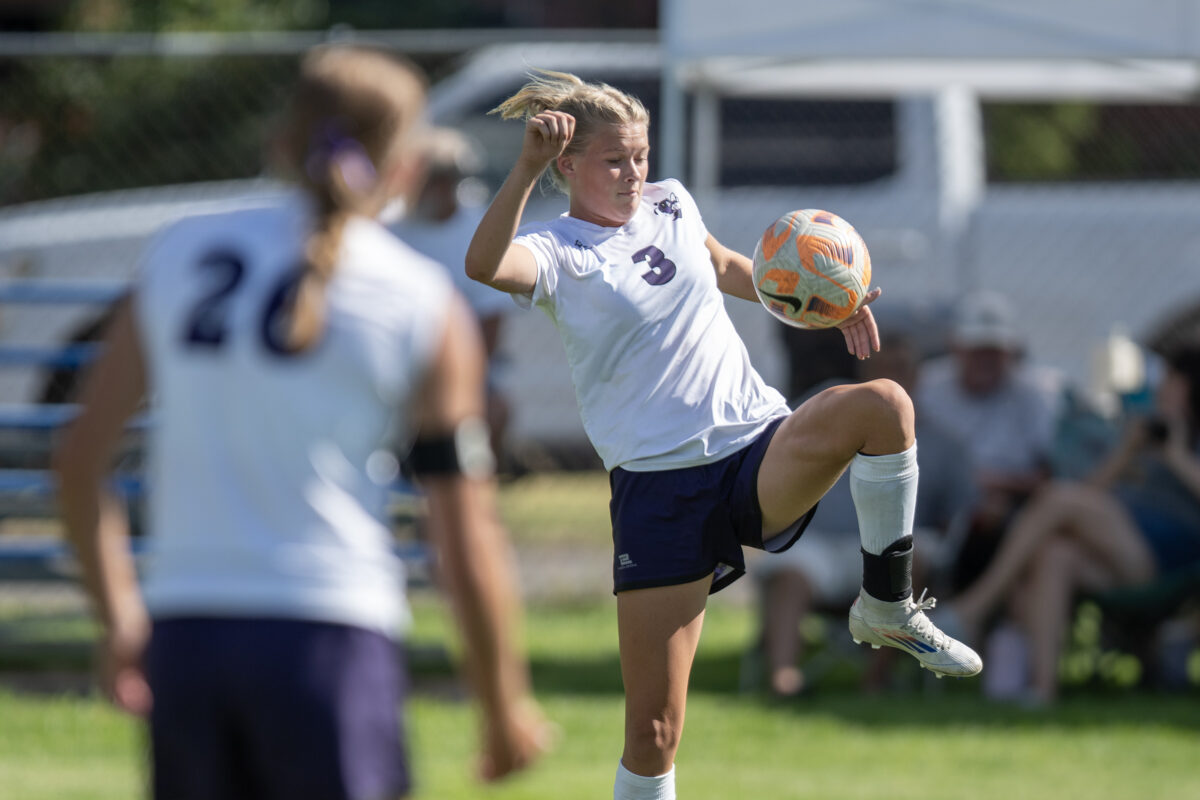 - Box Elder’s Oaklee Wylie (3) corrals the ball in a Region 5 match against Bonneville on Thursday, Aug. 15, 2024, in Washington Terrace.