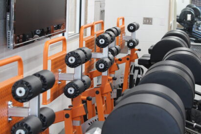 East of the stadium and fieldhouse, West Field football can access nearby weightlifting facilities. Multiple rooms house traditional weightlifting equipment and other spaces cater group workouts and training sessions.