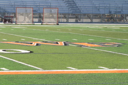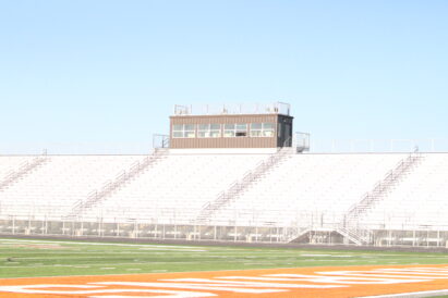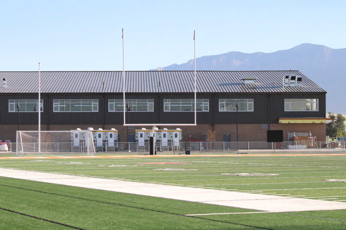 The stadium’s north end zone also features temporary accommodations for restrooms and concessions, which are set to be available later this season inside the school’s multipurpose fieldhouse. The fieldhouse — nicknamed “the barn” — will feature permanent restrooms and concessions on the south wall facing the north end zone.