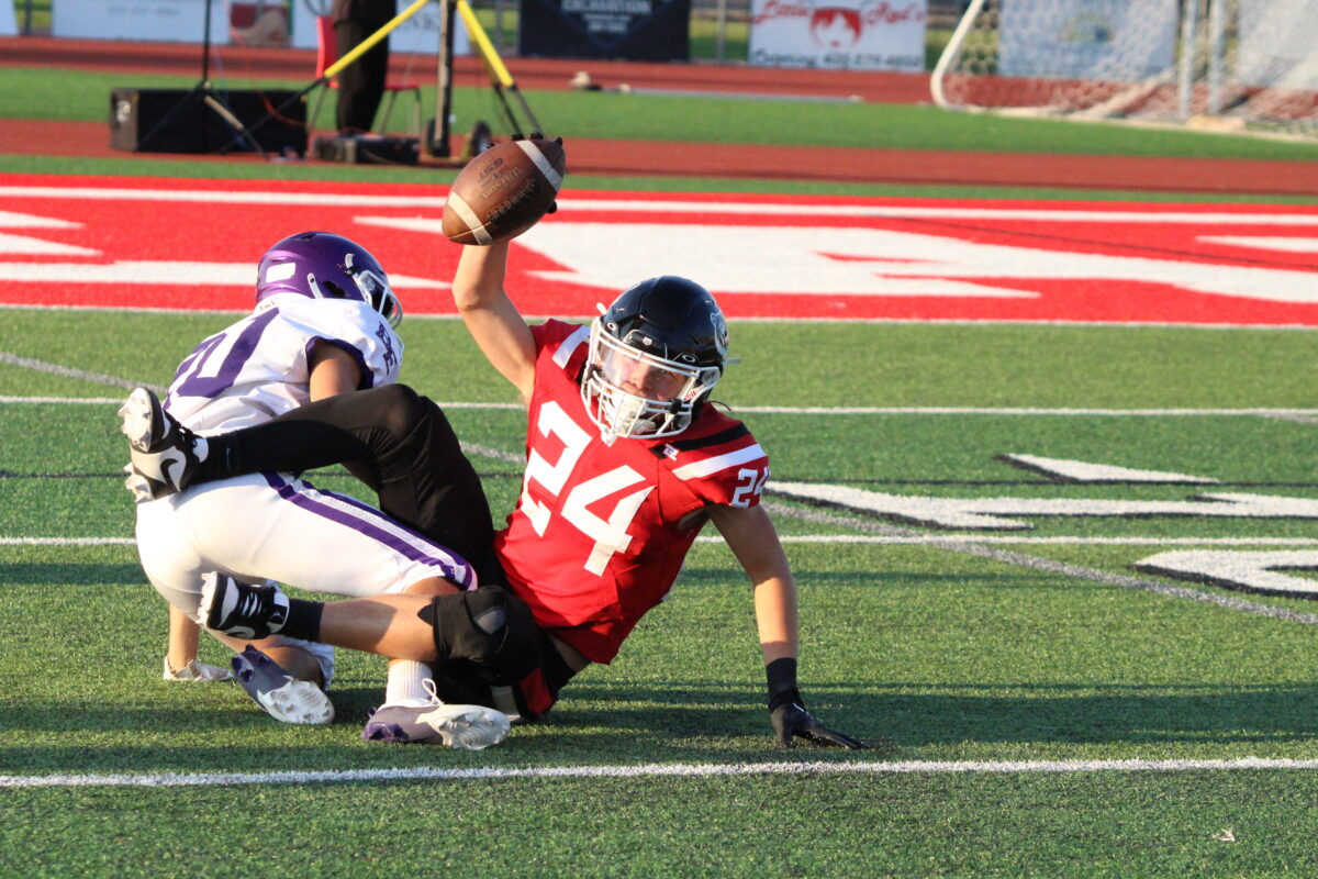 - Bear River sophomore Eli Braegger (24) raises the ball after completing a pass defended by Box Elder junior Korbin Jeppesen (20) during the 104th annual Golden Spike Game on Friday, Aug. 30, 2024, in Garland.