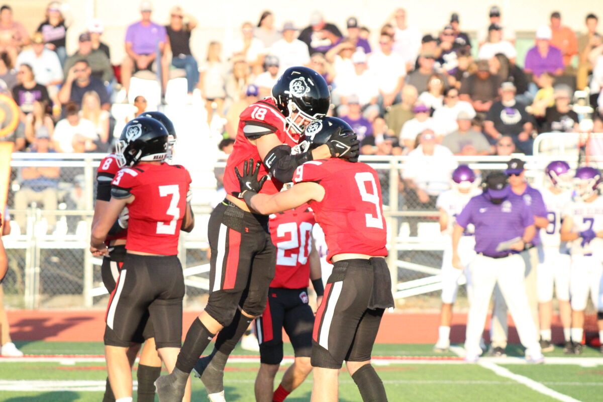 - Bear River junior Brecken Haynes (18) celebrated with senior Kash Avery (9) after a sack during the 104th annual Golden Spike Game on Friday, Aug. 30, 2024, in Garland.