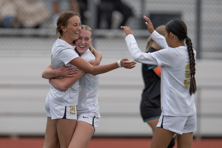 Davis High players, from left, Samantha Maudsley, Makenna Couser and Reial Phongsavath celebrate a goal against Farmington in a 6A state quarterfinal Thursday, Oct. 16, 2025, in Farmington.The 2025 Standard-Examiner All-Area Girls Soccer Second Team