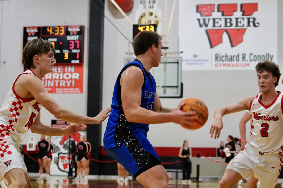 - Weber High’s Beau Potokar, left, and Derek Bowden, right, close in on Fremont’s Zach Hancock, center, during a nonregion boys basketball contest on Tuesday, Dec. 9, 2025, at Weber High School in Pleasant View.
