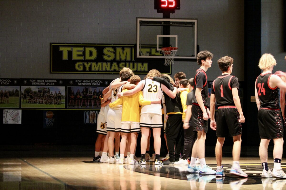 - Roy High players gather before a nonregion boys basketball contest against Park City on Wednesday, Dec. 10, 2025, inside Ted Smith Gymnasium at Roy High School in Roy.