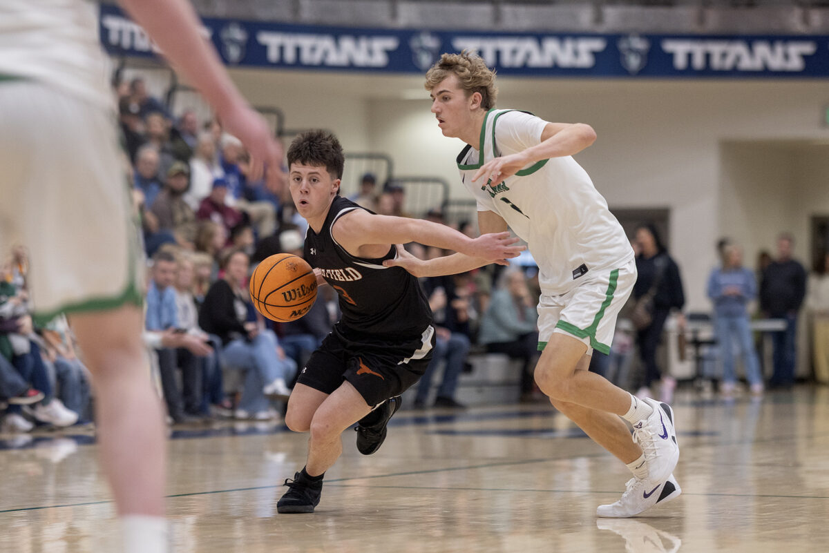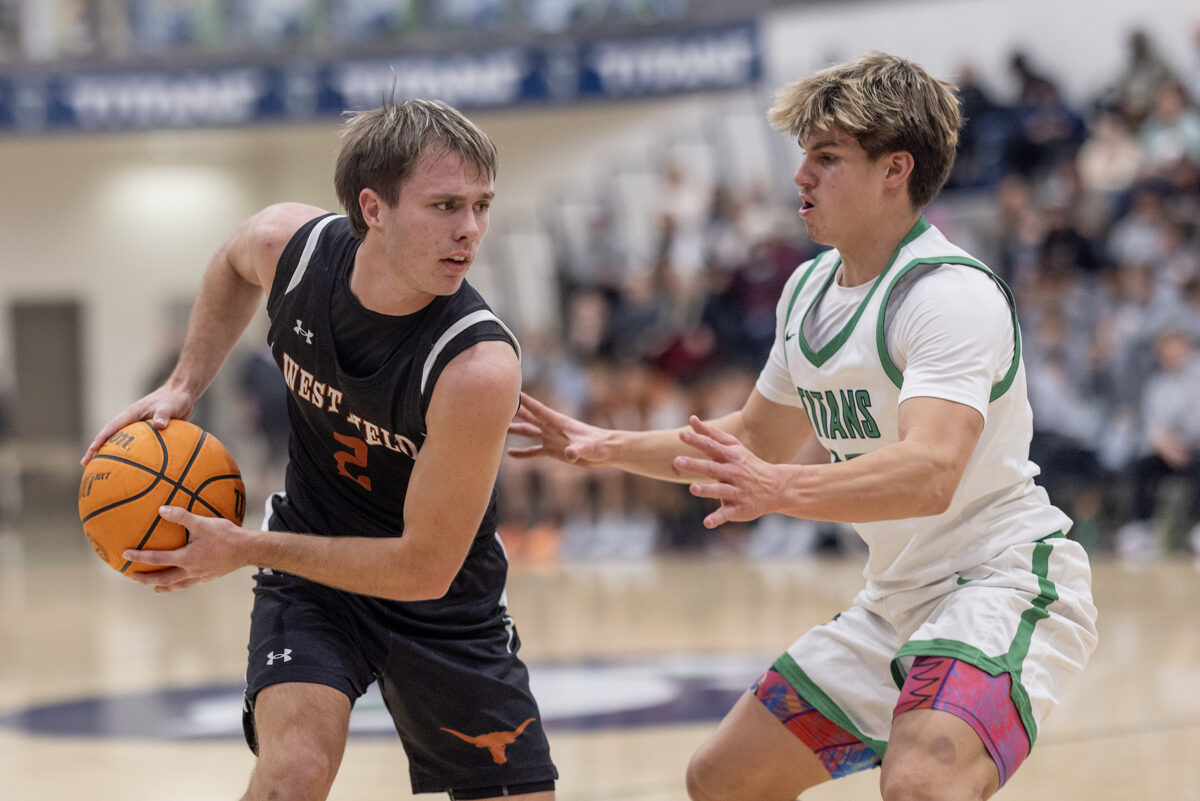 - West Field’s Daxton Laughter, left, tries to drive past Syracuse’s Bracken Lessey on Friday, Dec. 12, 2025, in Syracuse.