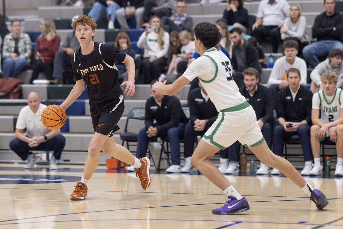 - West Field’s Cason Malan (21) swins the ball around the perimeter as Syracuse’s Nakoy Daw (35) defends on Friday, Dec. 12, 2025, in Syracuse.