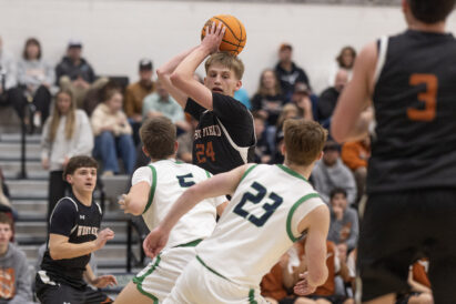 - Syracuse High’s Skyler Orton (33) rises to shoot as West Field defenders Daxton Laughter, left, and Karter Rich, center, defend on Friday, Dec. 12, 2025, in Syracuse.