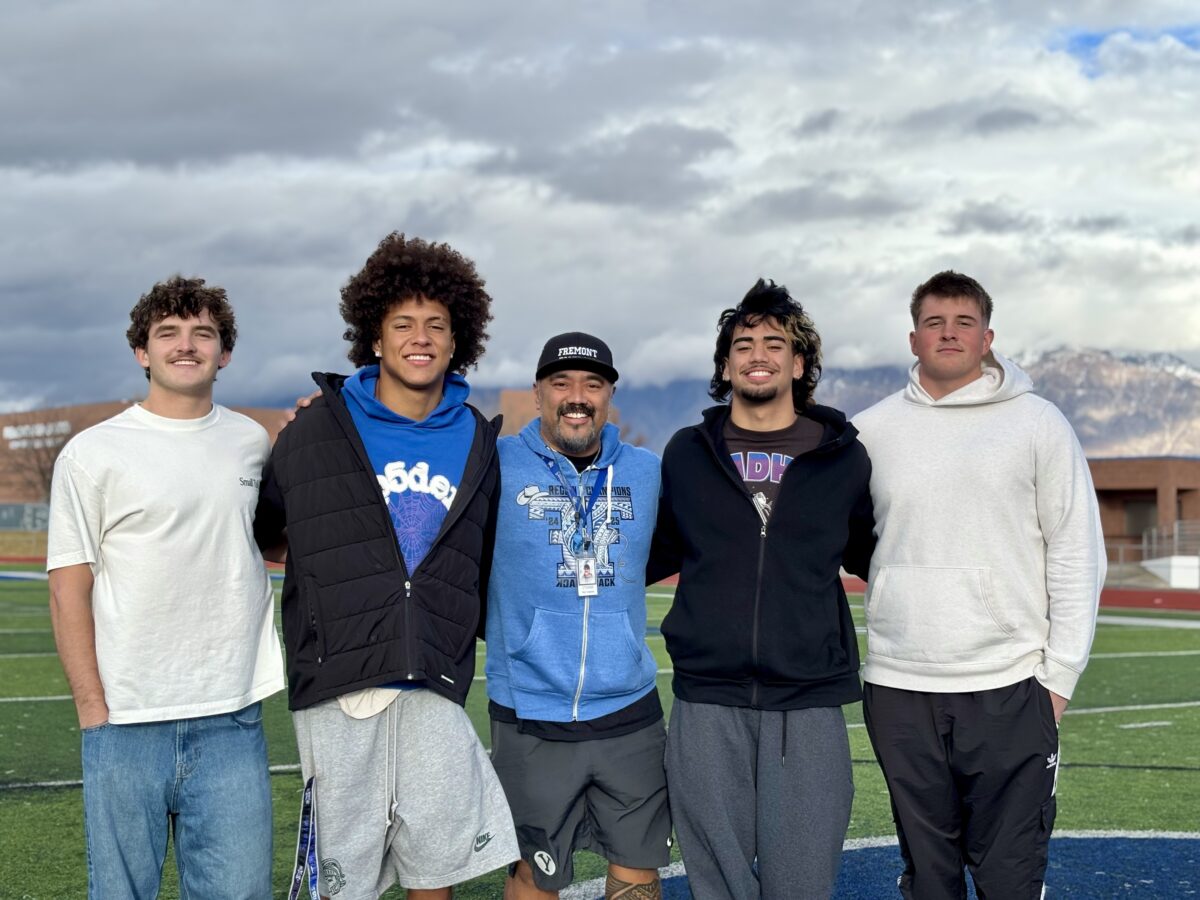 - Left to right: Fremont High’s Slade Parker, Salesi Moa, Nate Tuatagaloa, Manase Tuatagaloa and Cooper Allen pictured at Moyes Stadium on Wednesday, Dec. 17, 2025, at the school in Plain City.